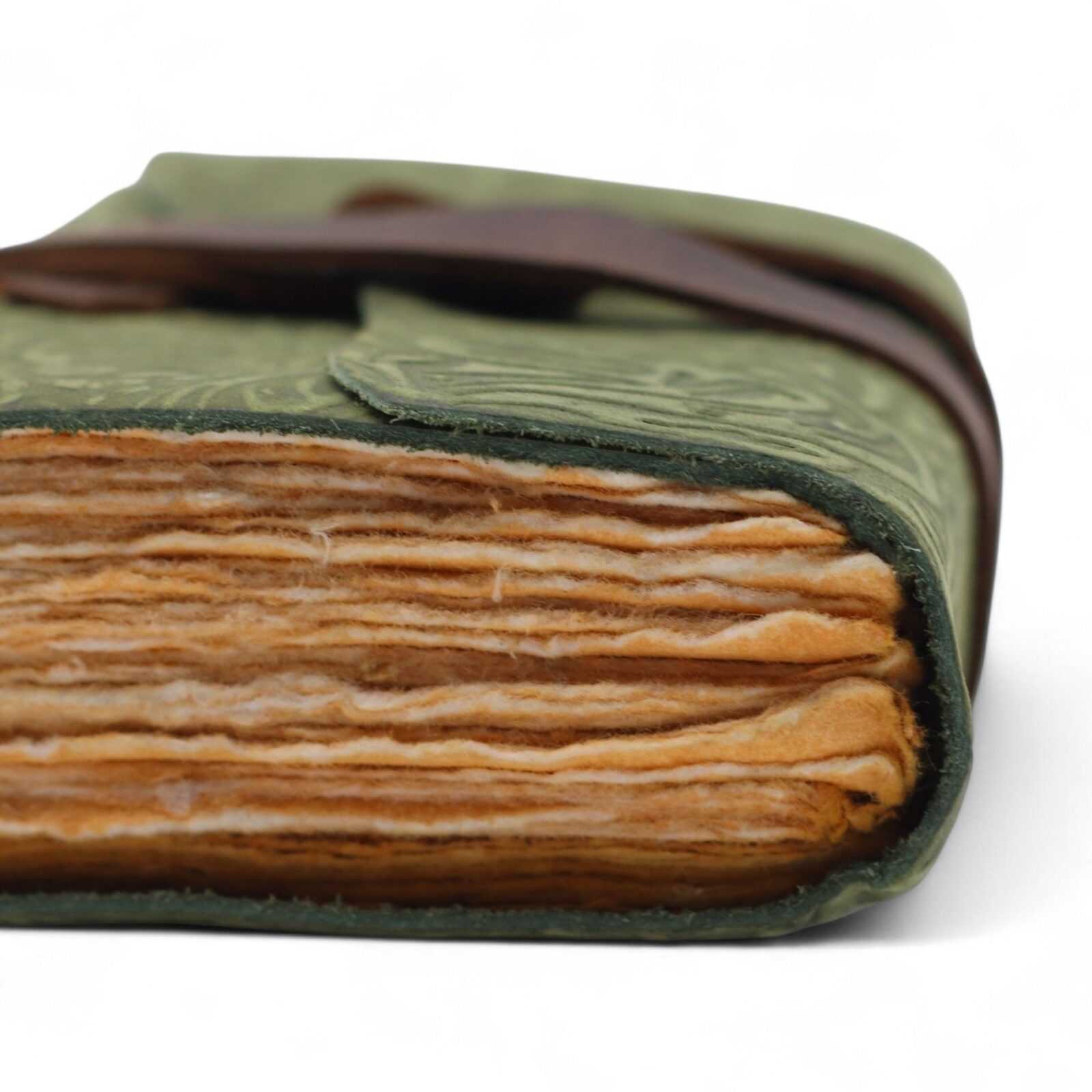 A compact leather journal with an embossed green maze design and a rustic deckled edge finish. The natural leather wrap keeps your pages secure, making it perfect for daily notes, creative writing, or sketching on the go.