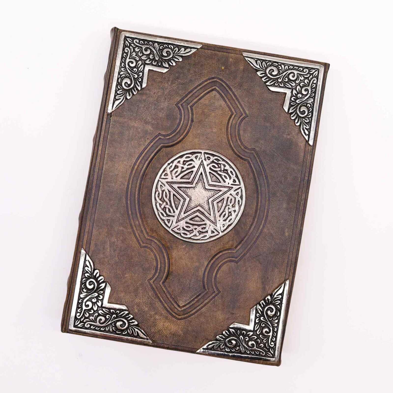 Hefty Brown Tan Book with Zinc Pentagon Decor is crafted with luxurious brown tan leather, ensuring a premium feel and look. The thick cover protects the pages, and the binding lays flat for comfortable writing.