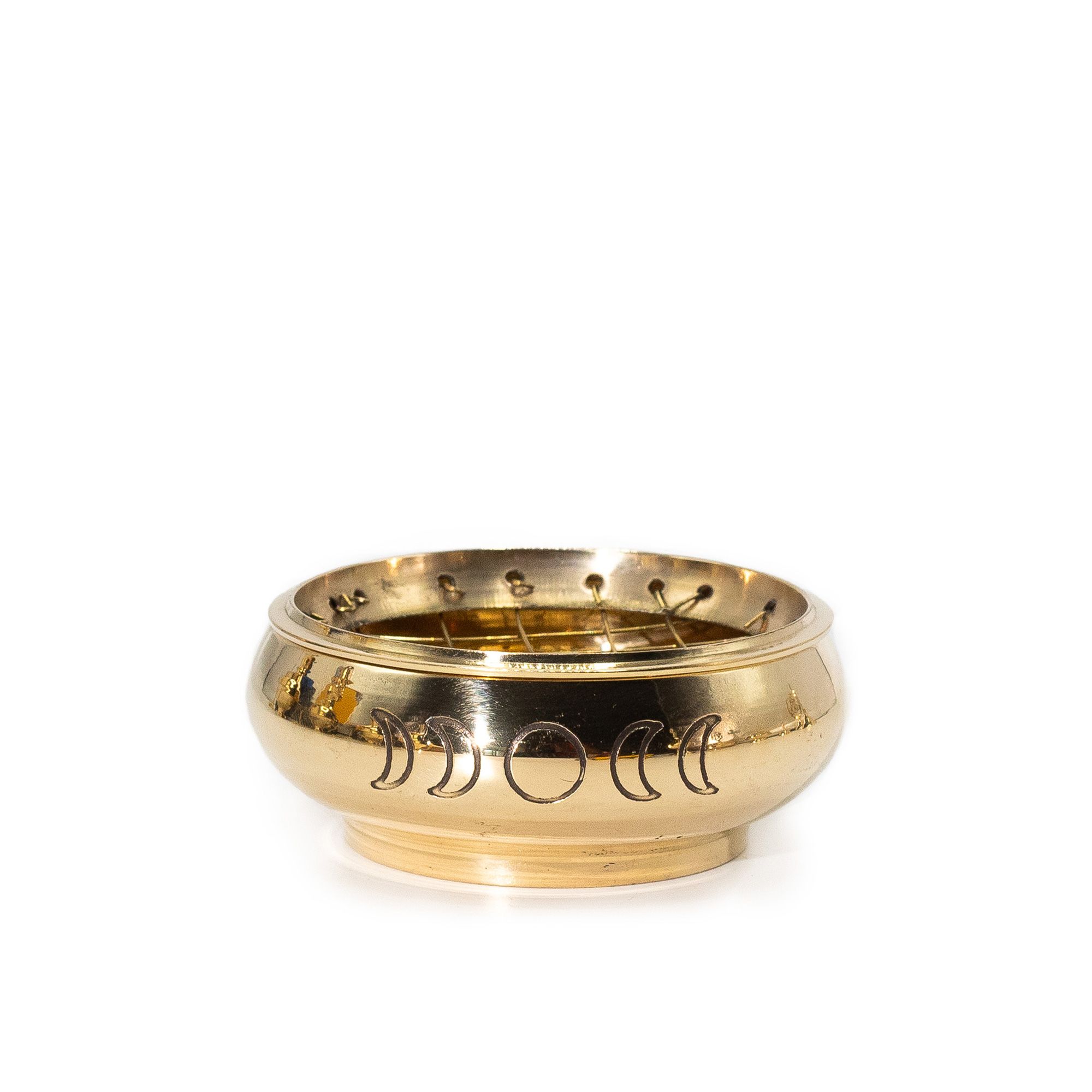 Handmade in India from polished brass, this wide incense jar is engraved with the full lunar cycle. Its moon phase design adds both beauty and symbolism, making it a meaningful tool for burning resins, herbs, or powdered incense over charcoal.