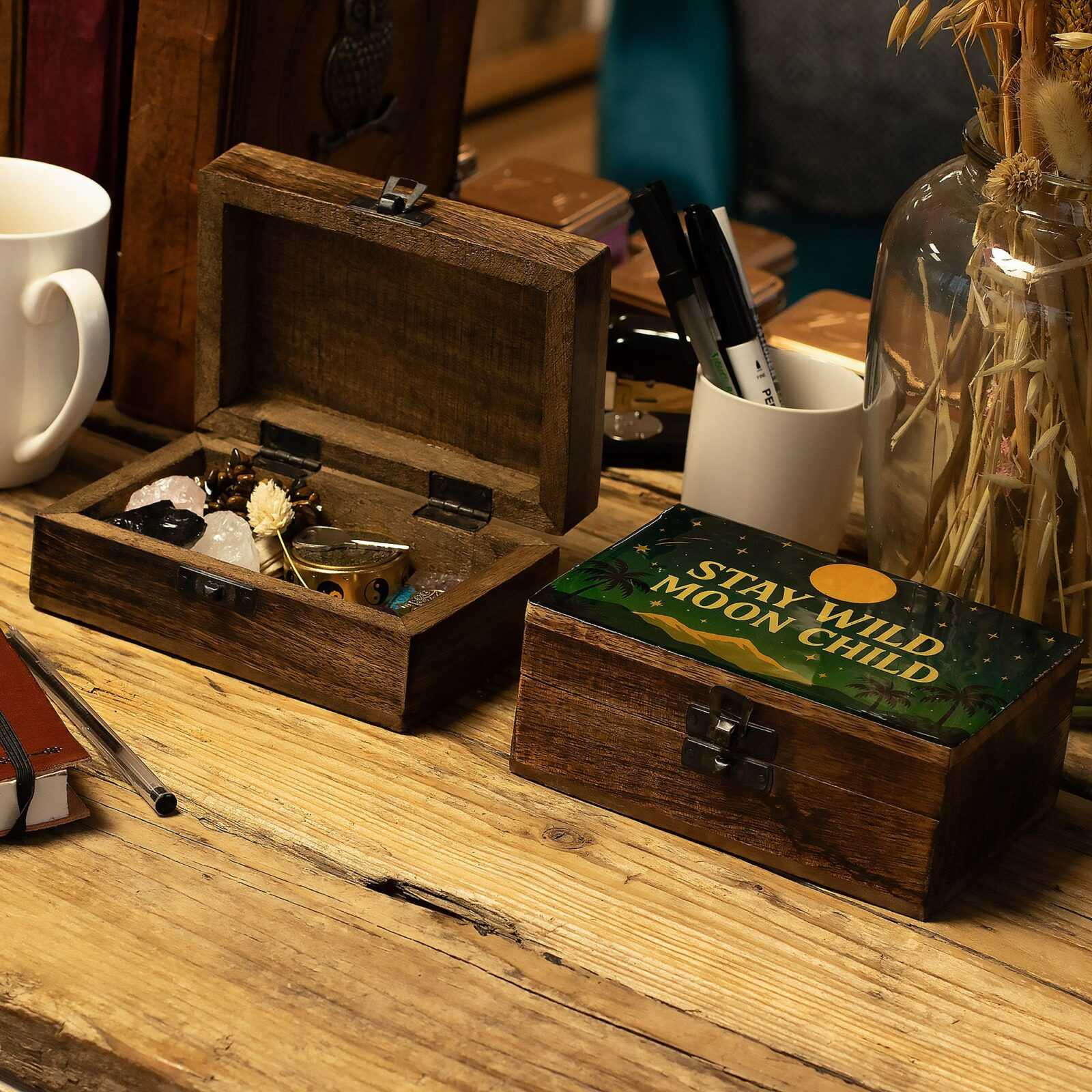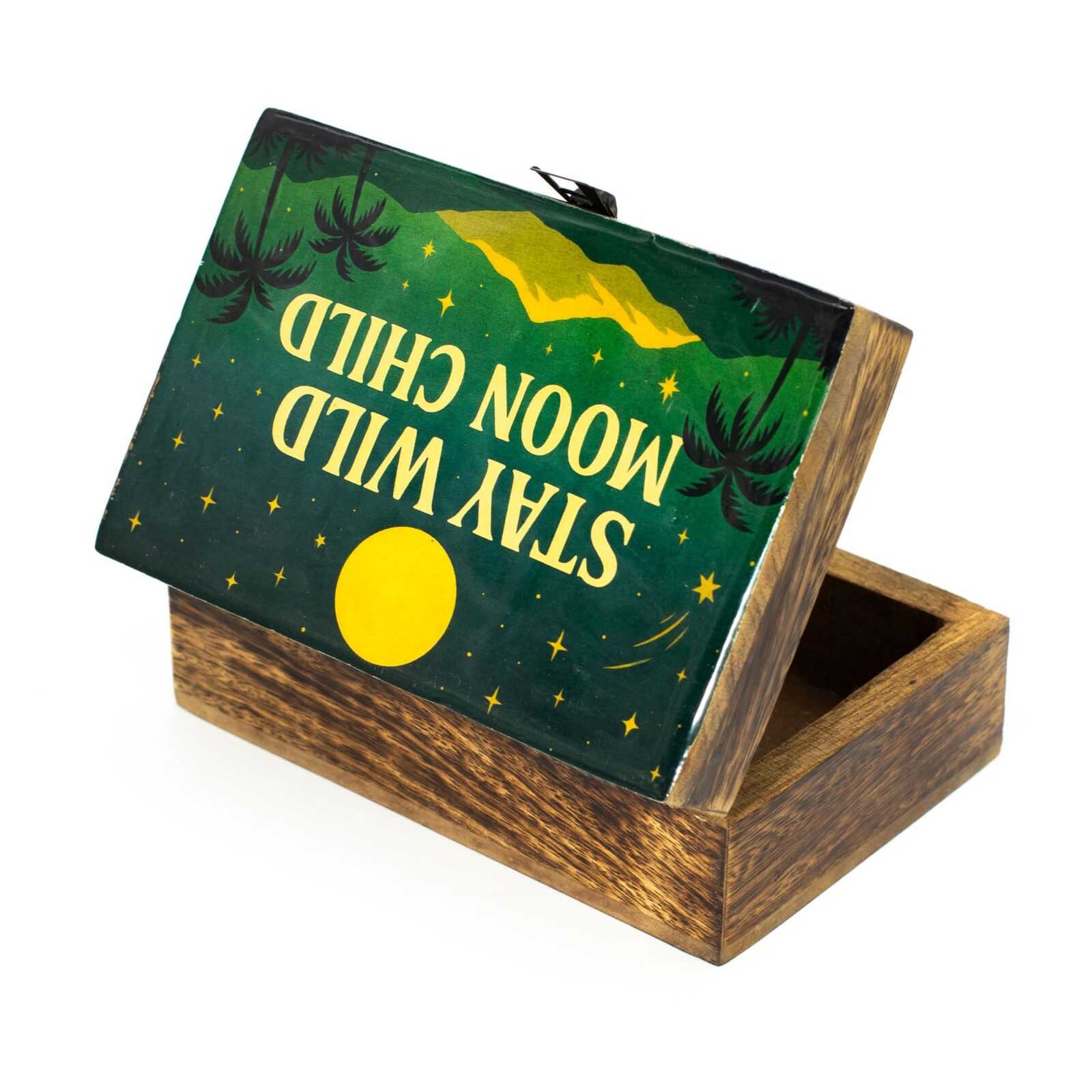 This medium mango wood box offers a little more space for the things that matter most. The enamelled lid features the Stay Wild Moon Child design, with moonlit skies, distant mountains, and palm silhouettes creating a calm, wanderer’s mood that feels both grounded and free.