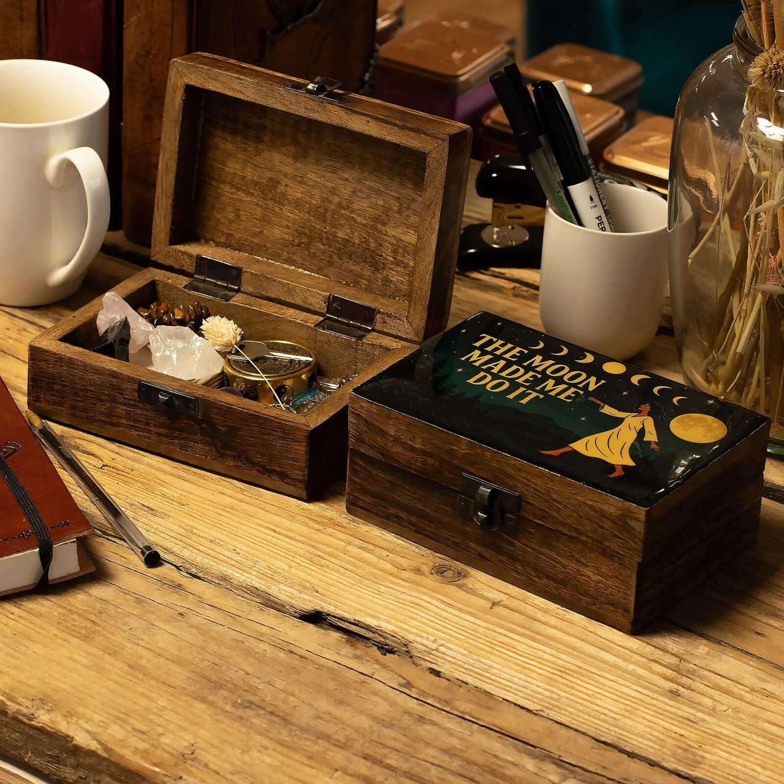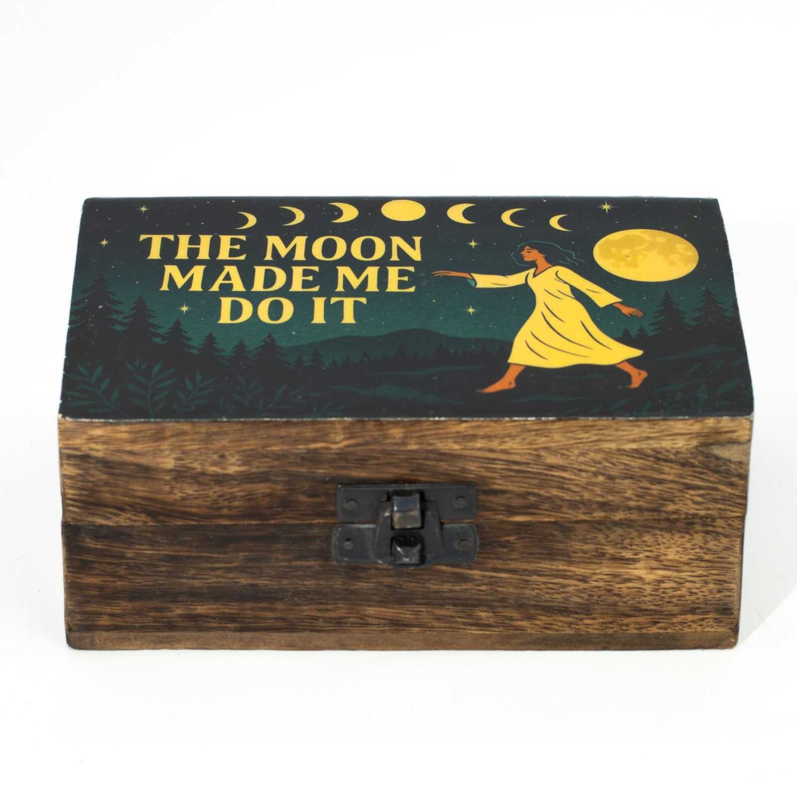 This medium mango wood box brings humour, intuition, and lunar energy together in one beautifully illustrated piece. The enamelled lid features The Moon Made Me Do It design, with moon phases, a night-time forest, and a dreamlike figure moving under a glowing full moon. It feels playful, expressive, and a little bit mischievous.