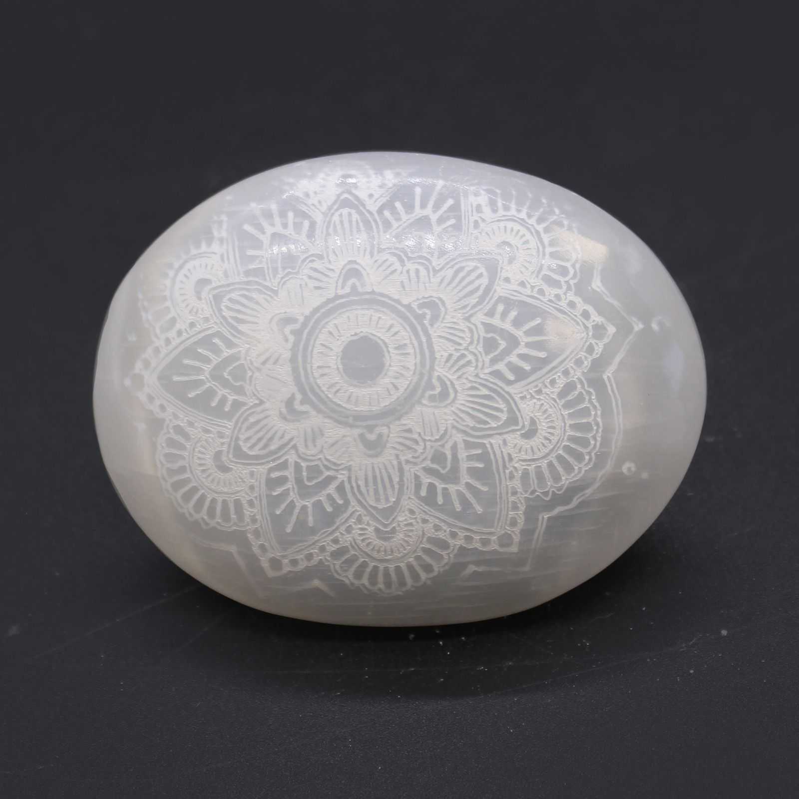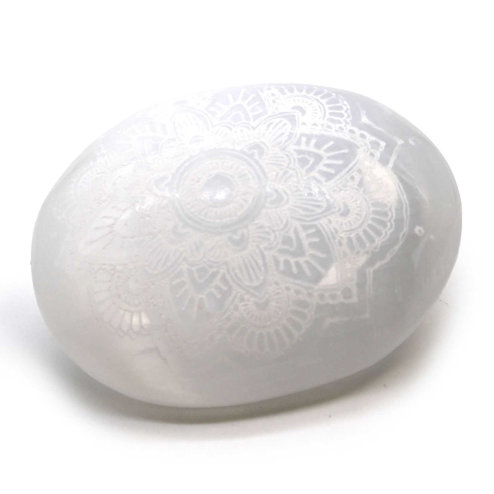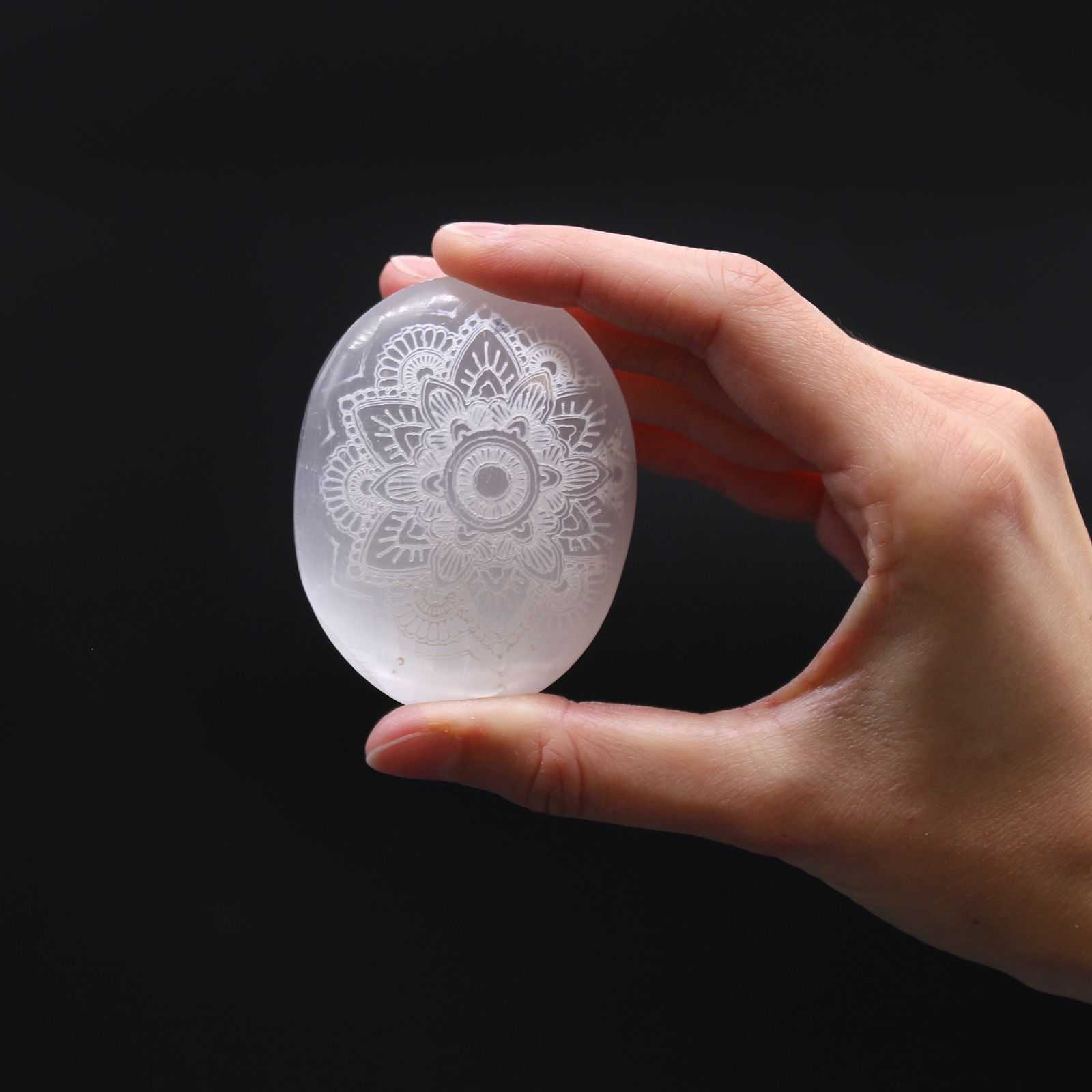 Selenite Palm Stone – Mandala Engraved