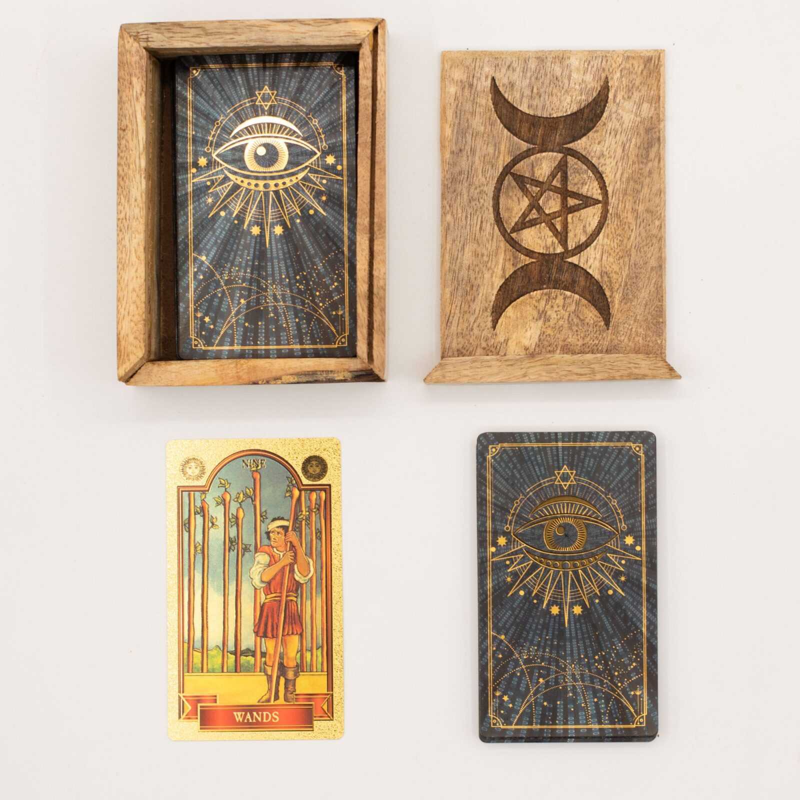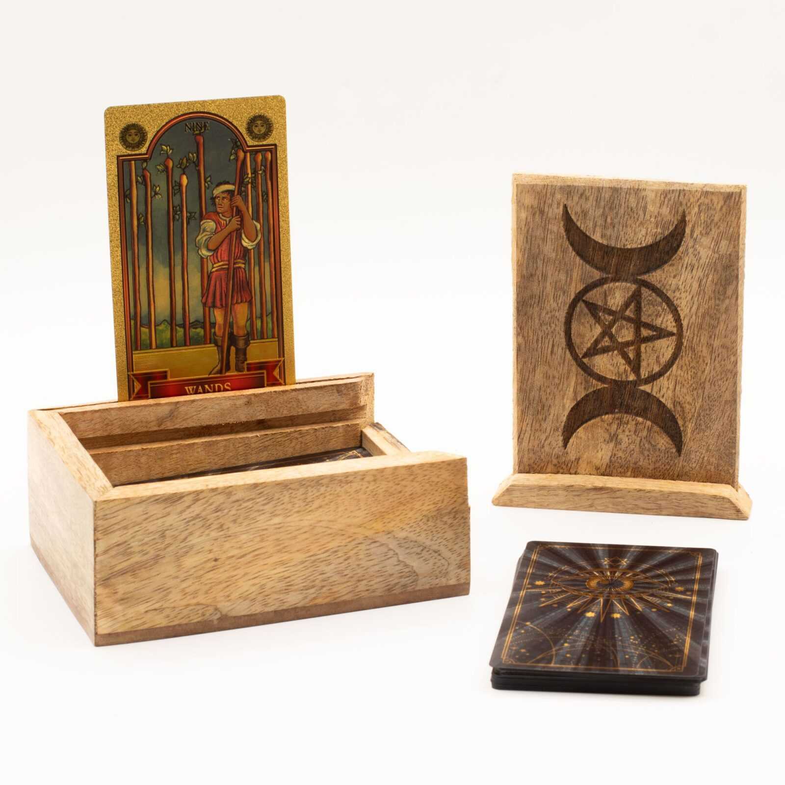 A clean, practical tarot card box designed for everyday readings. Crafted from mango wood, this box features a dedicated card compartment alongside an integrated upright display for showcasing key cards during a reading.