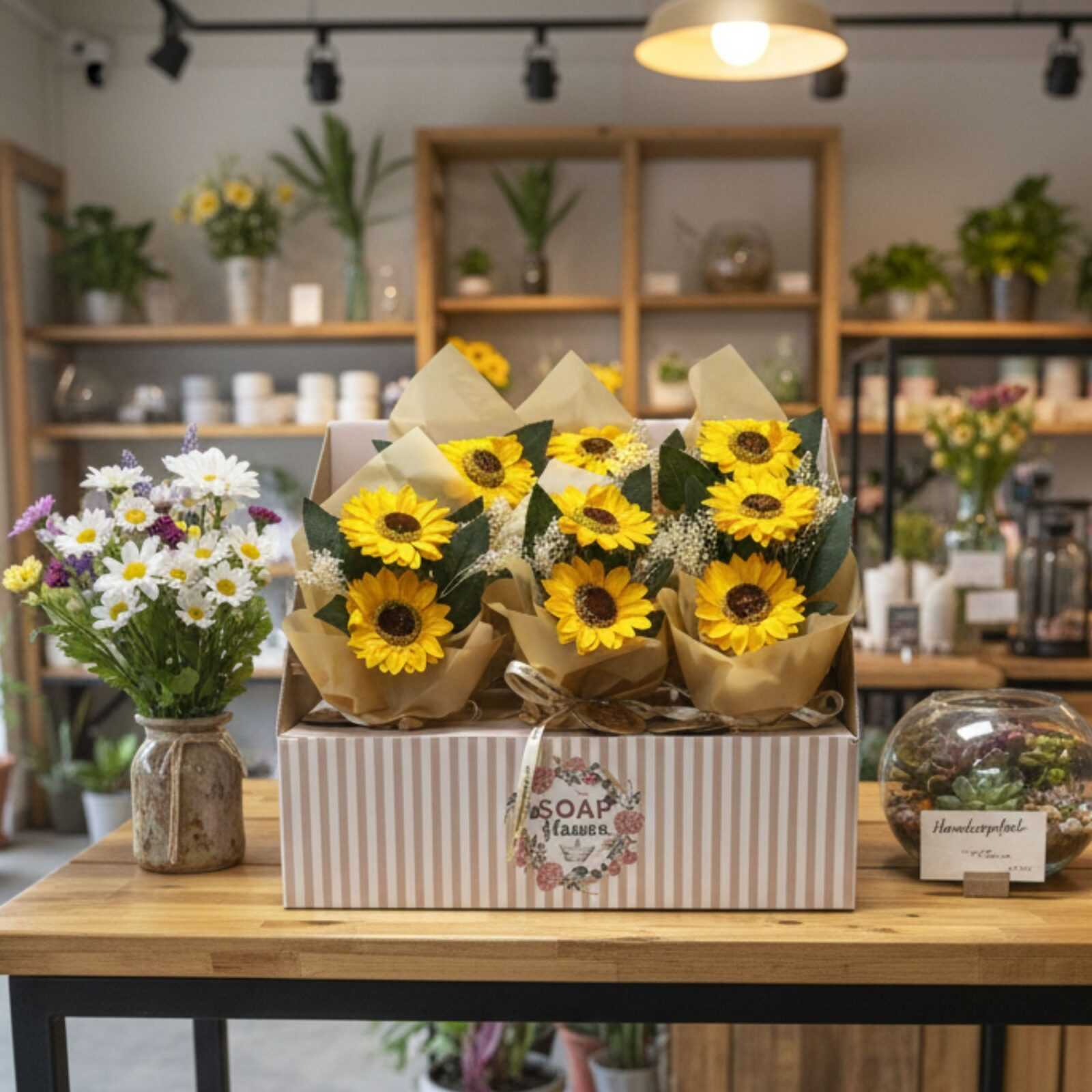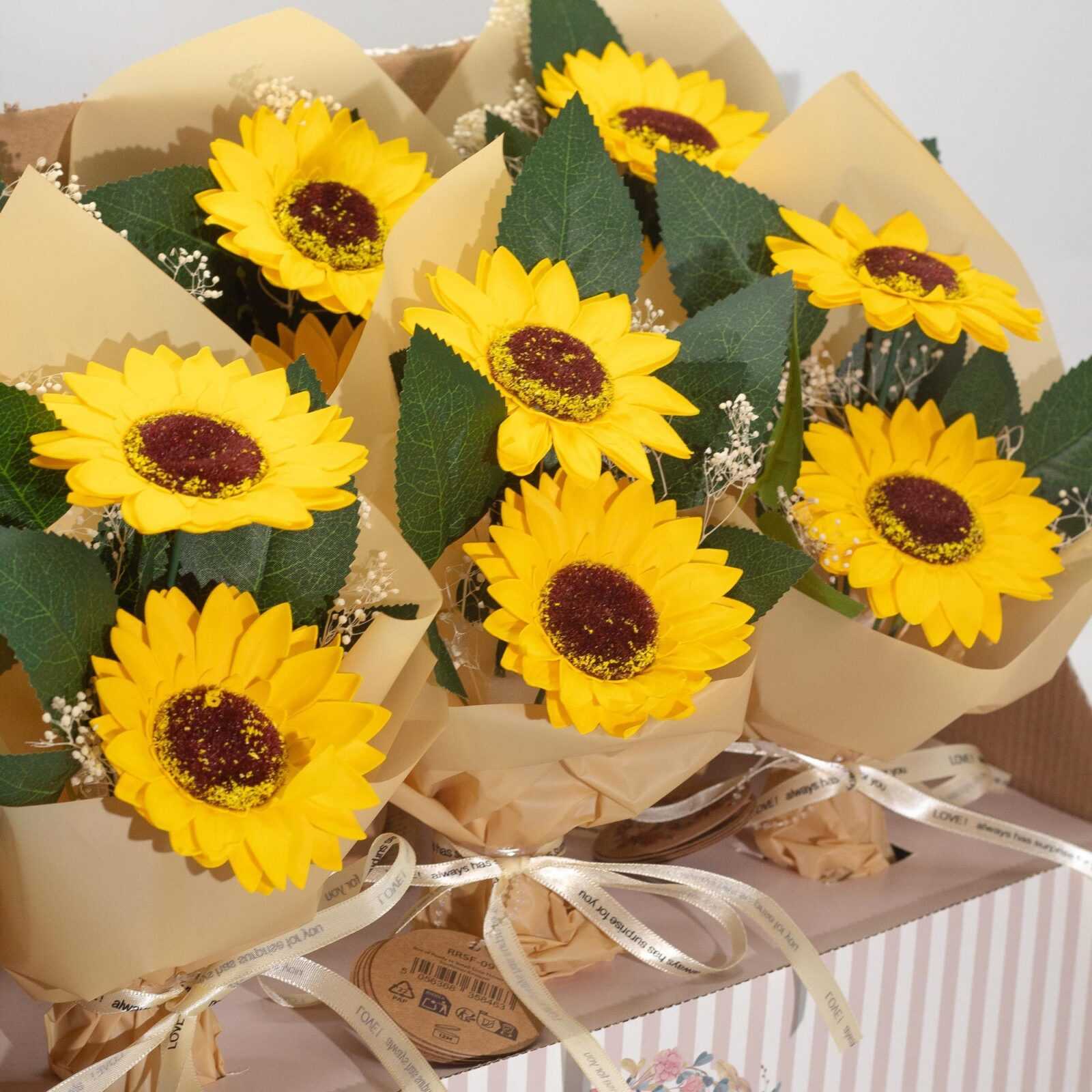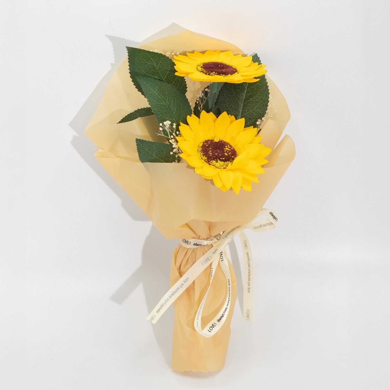 A cheerful and long-lasting alternative to fresh blooms, this Soap Flower Two Sunflower Bouquet brings a burst of sunshine to any space. The vibrant yellow petals and delicate white accents are carefully crafted from soap, offering a realistic look.