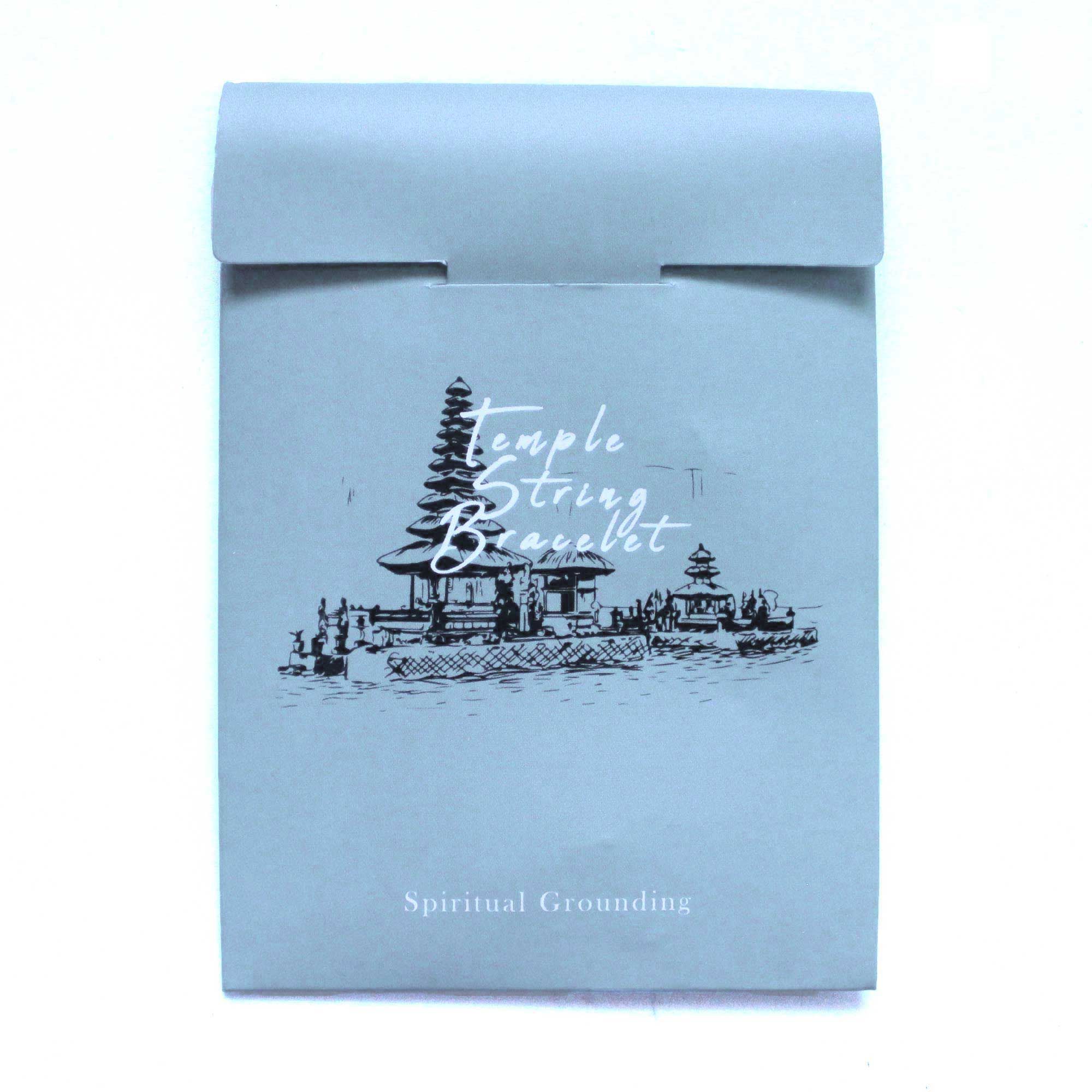 Each Temple String Bracelet – Spiritual Grounding is packed in a blue paper bag with a short description of its intention: