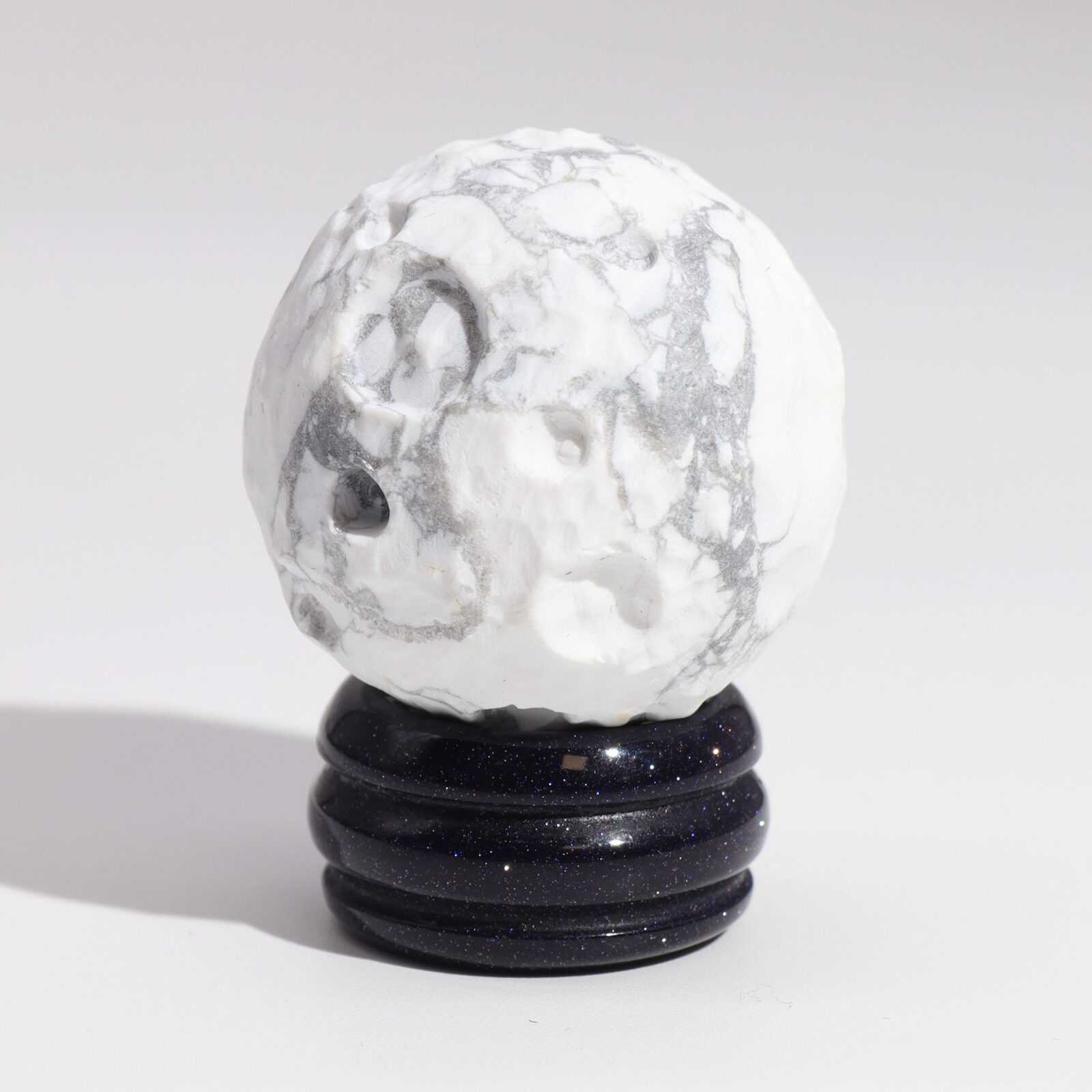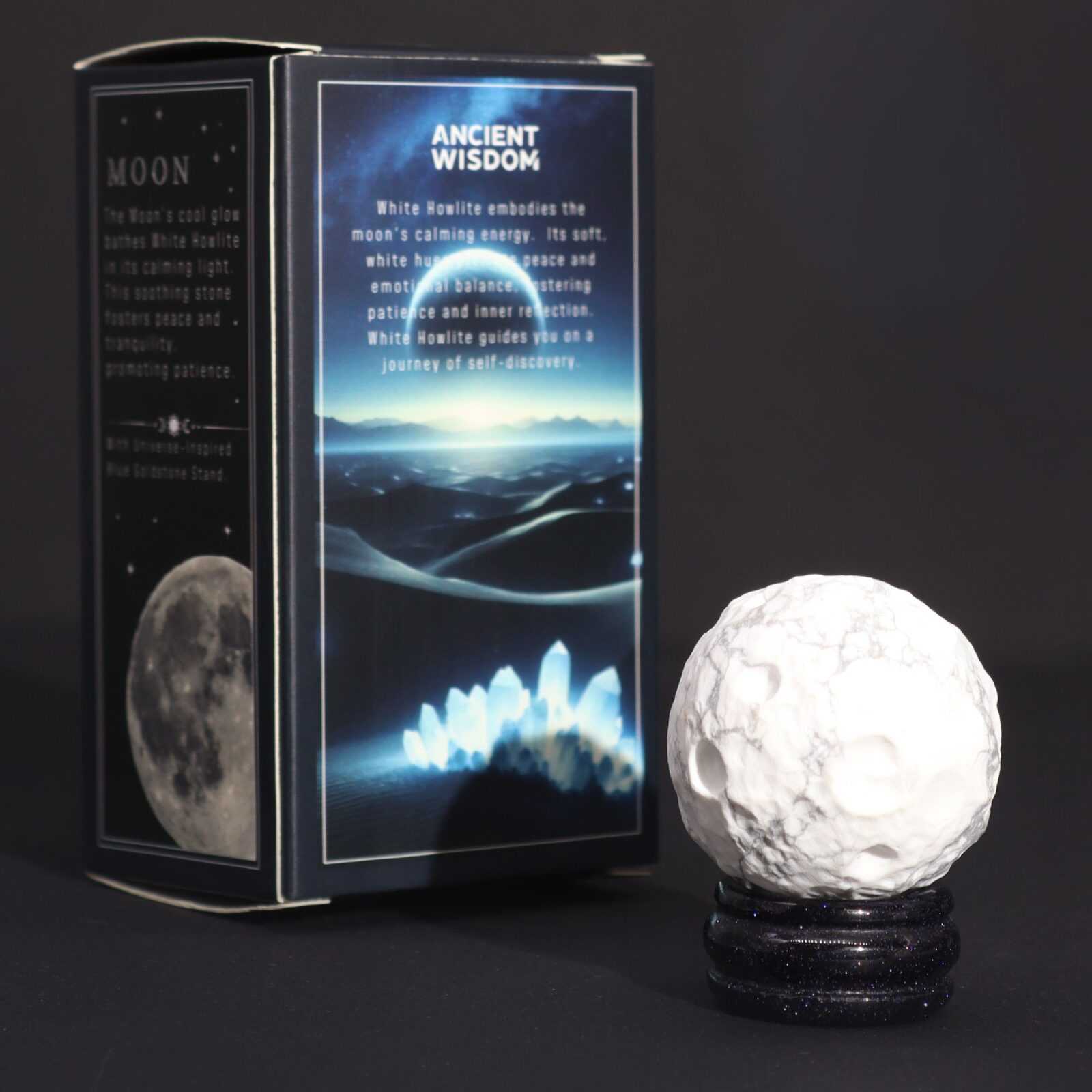 The Solar Goldstone Stand, inspired by the cosmic depths, provides a grounding base for the White Howlite sphere.